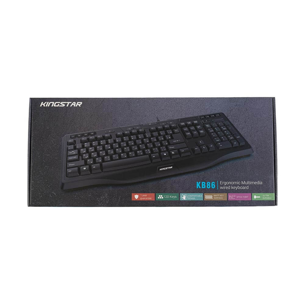 کیبورد کینگ استار مدل kb86 از نوع سیم دار میباشد و از طریق درگاه USB این کیبورد دارای 120 کلید برای انجام فعالیتهای کامپیوتری است.